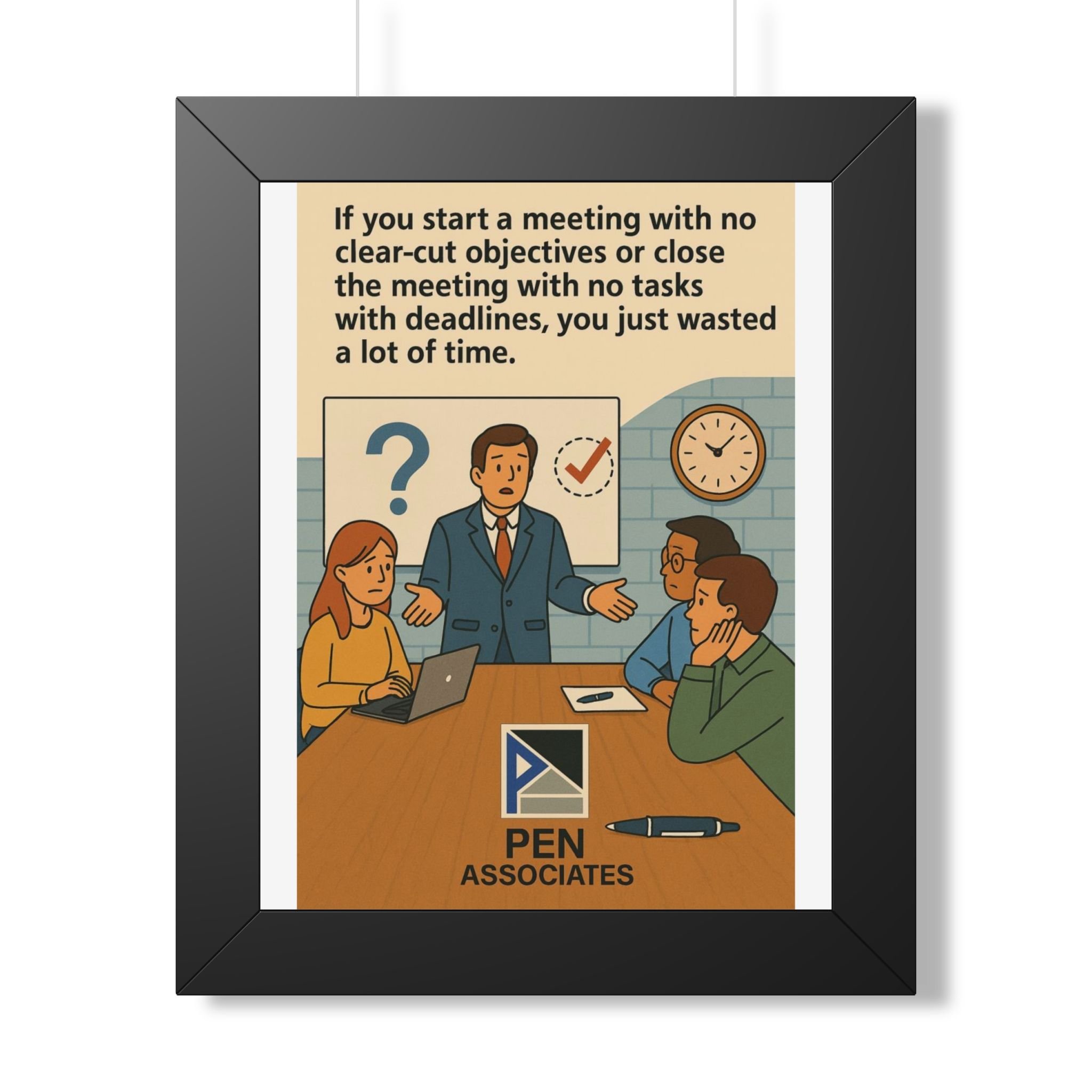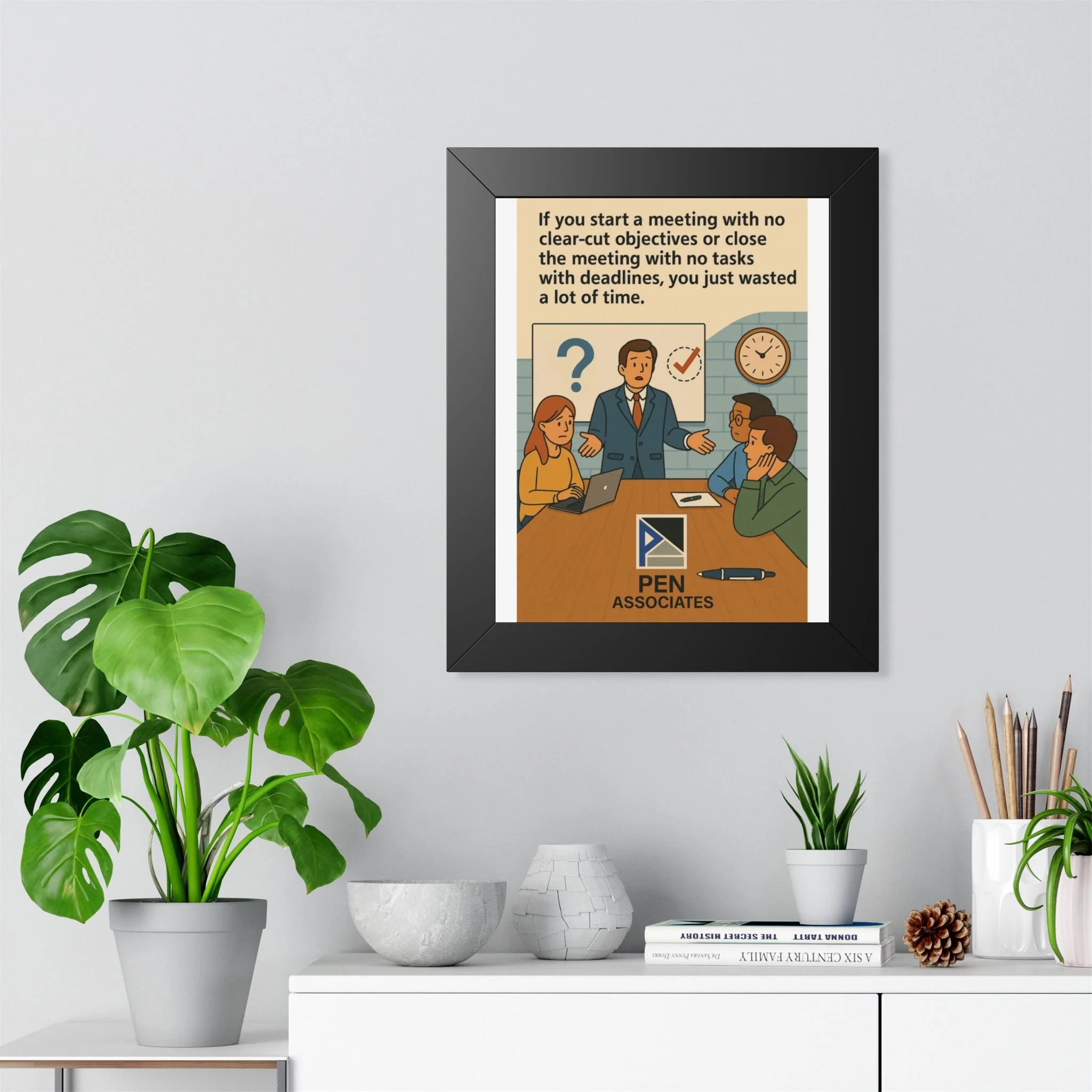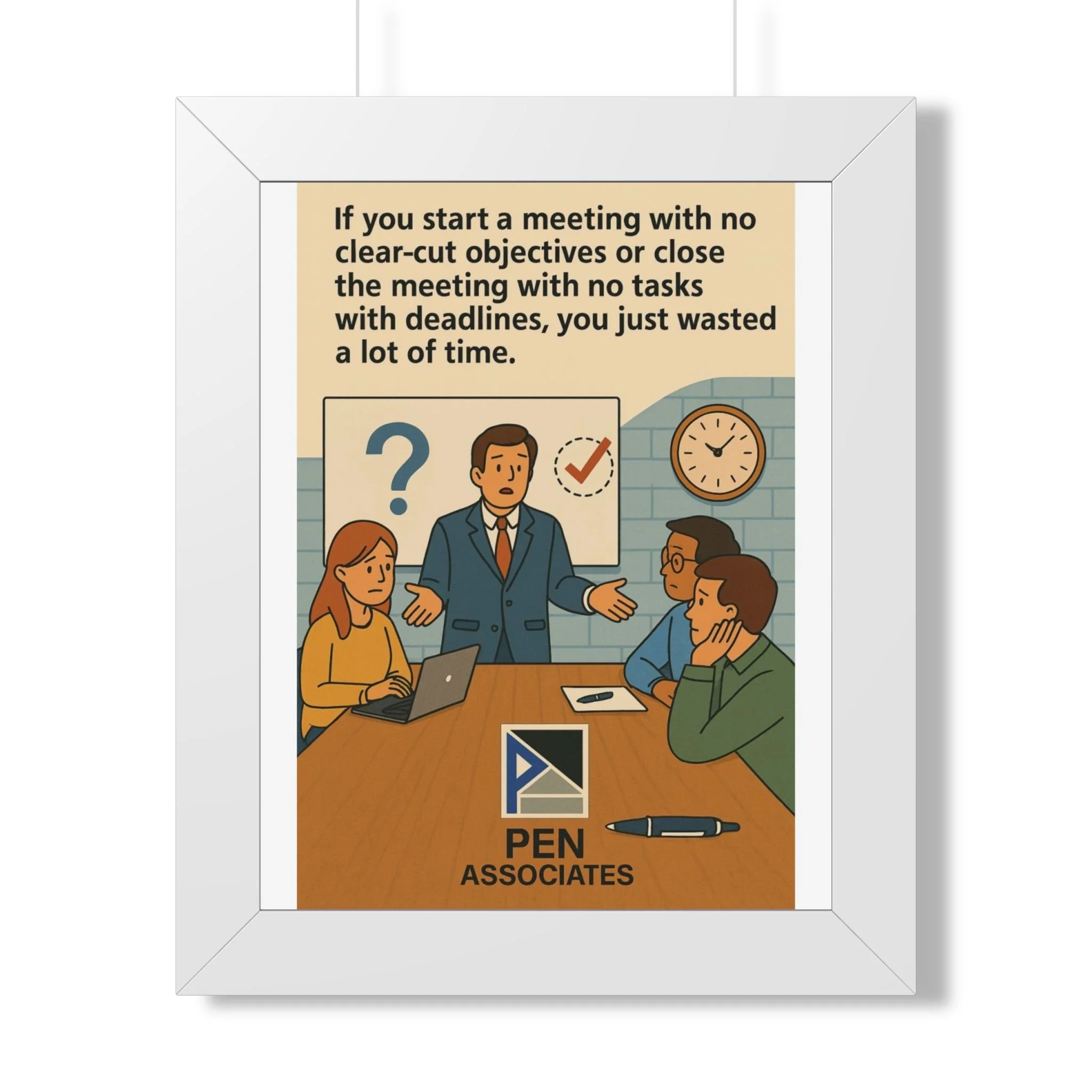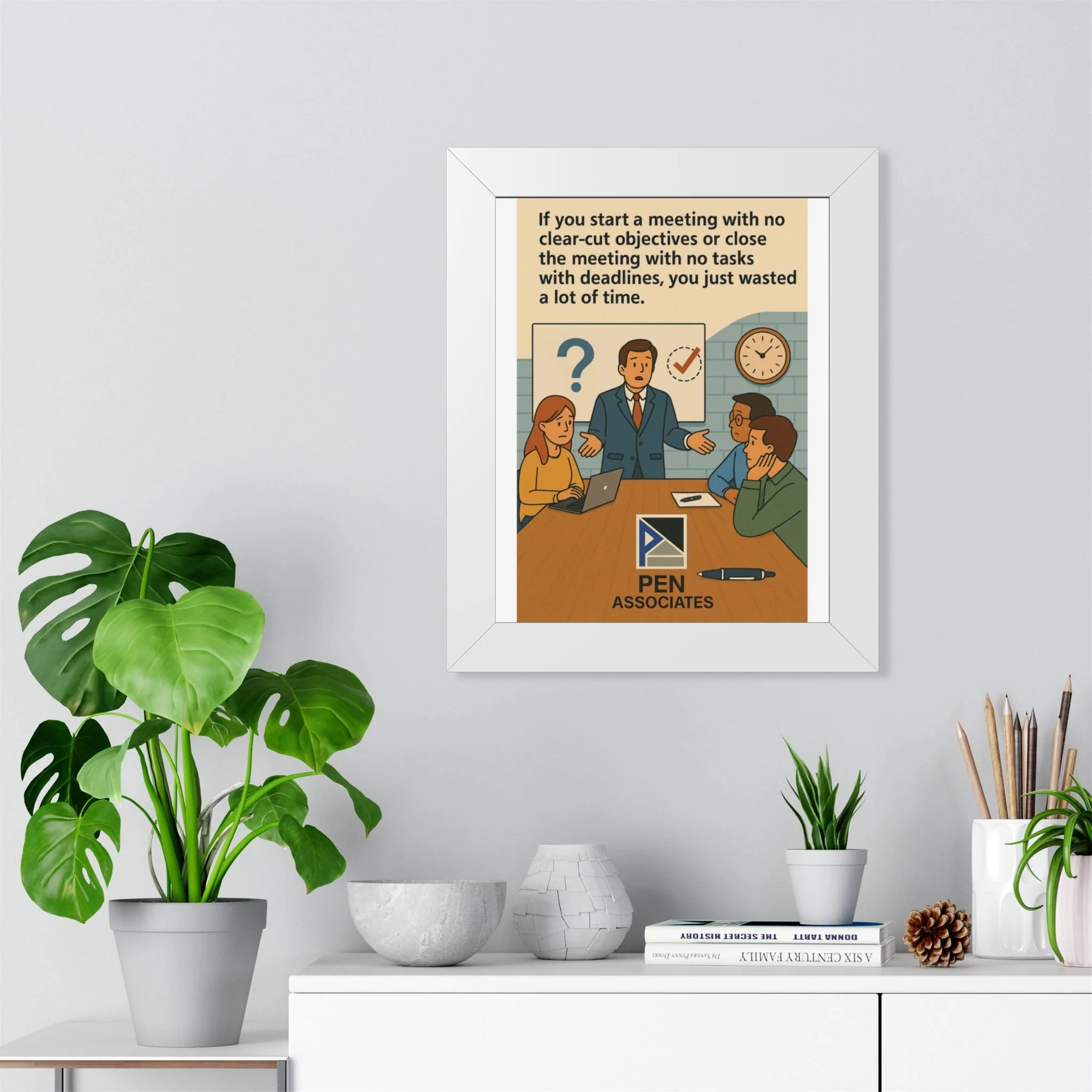 A framed vertical poster that brings vintage office wisdom into modern workspaces. The matte museum-grade print shows a retro-style illustration of a meeting scene with a clear, punchy quote about meeting objectives and tasks. Framed in your choice of sleek black, clean white, or warm walnut, the poster arrives ready to hang with built-in or included hardware and a protective acrylic cover. It sits flat against the wall and reads well from a desk or hallway, offering a quiet reminder to run meetings with purpose and follow-through.