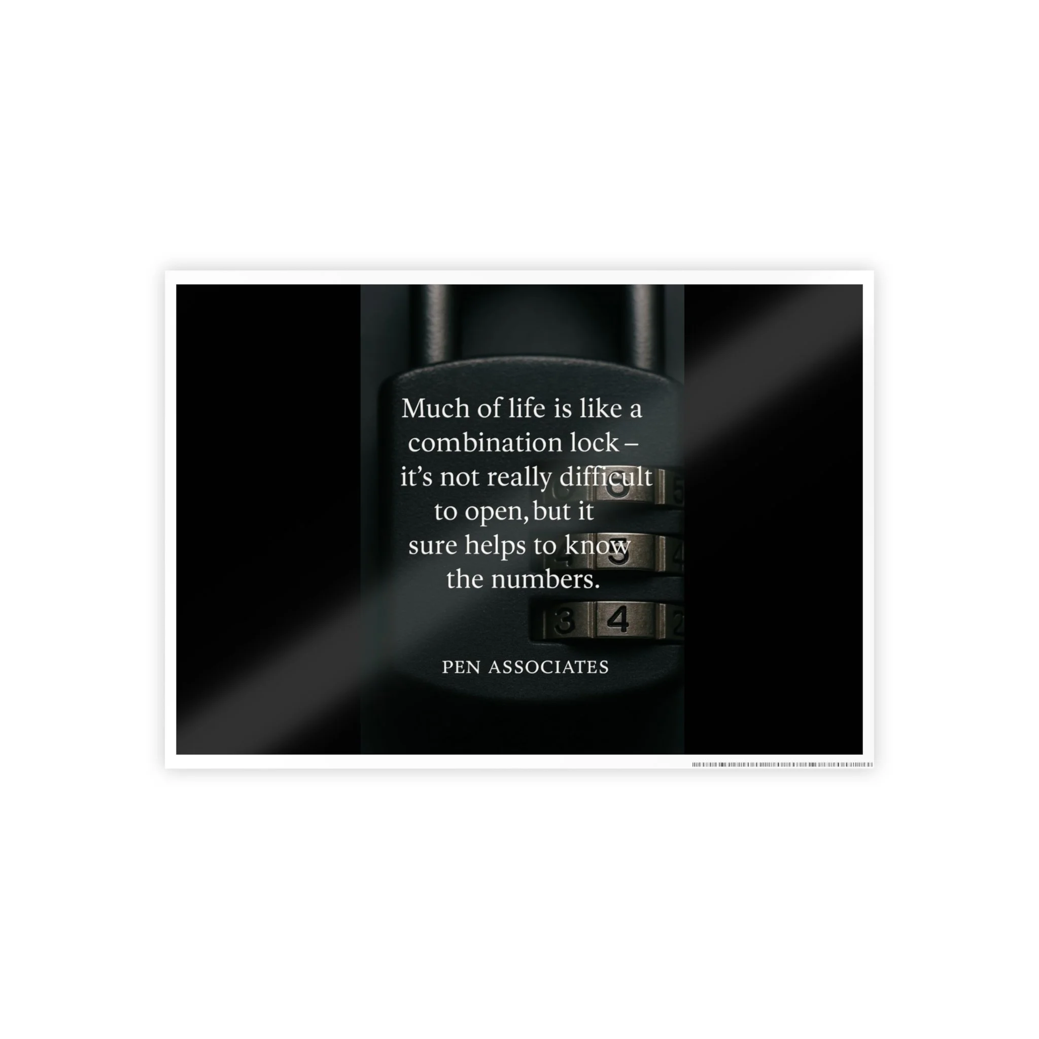 A high-gloss poster that catches the eye and adds thoughtful contrast to a workspace or study. Deep blacks and crisp highlights make the lock imagery and typed quote read like a quiet whisper across the wall. Hung above a desk or leaned on a shelf, it creates a focused, slightly mysterious mood—perfect for people who enjoy clever, thoughtful art that invites a second look. The glossy surface gives colors a luminous pop, while the subtle white border and small barcode add an intentional, archival feel.