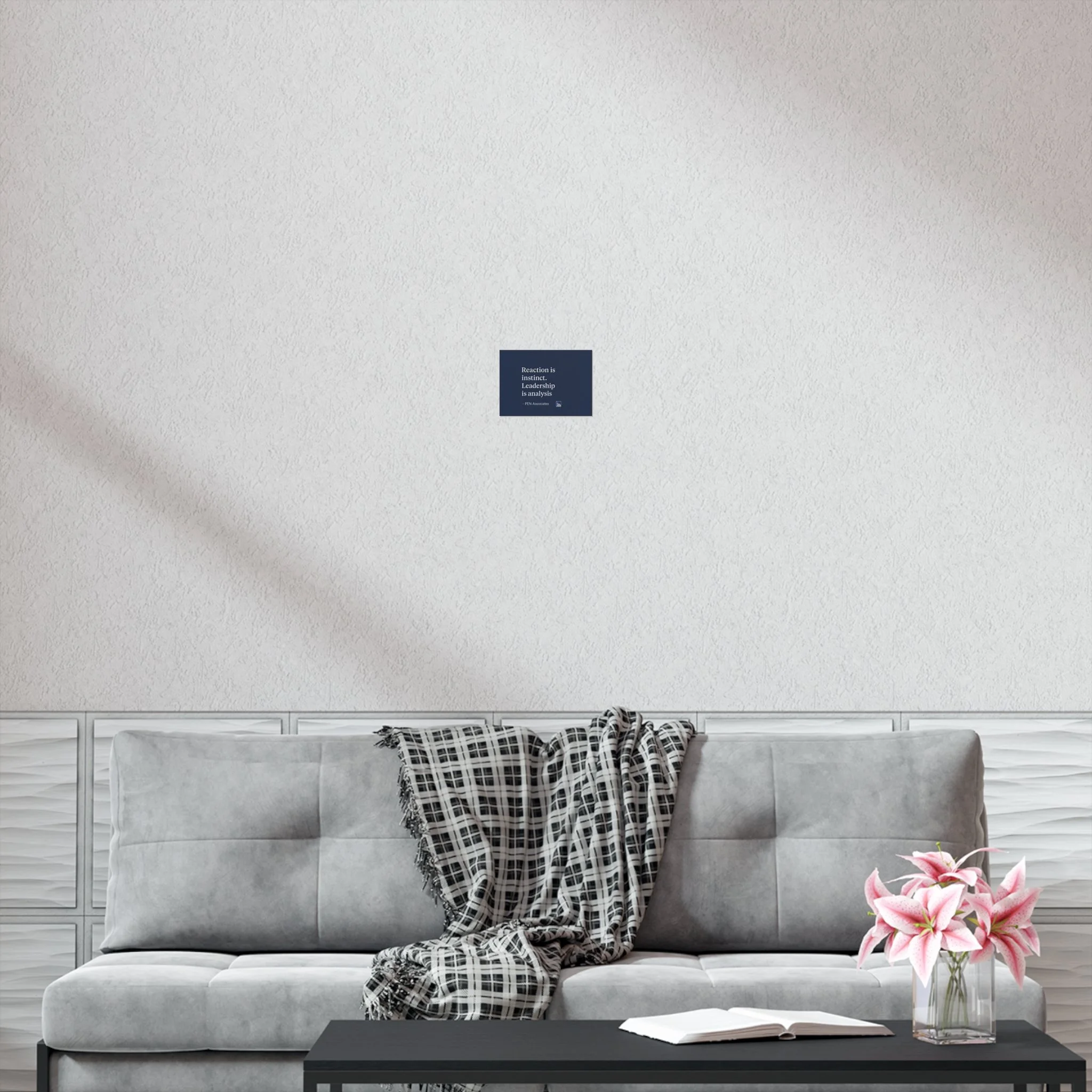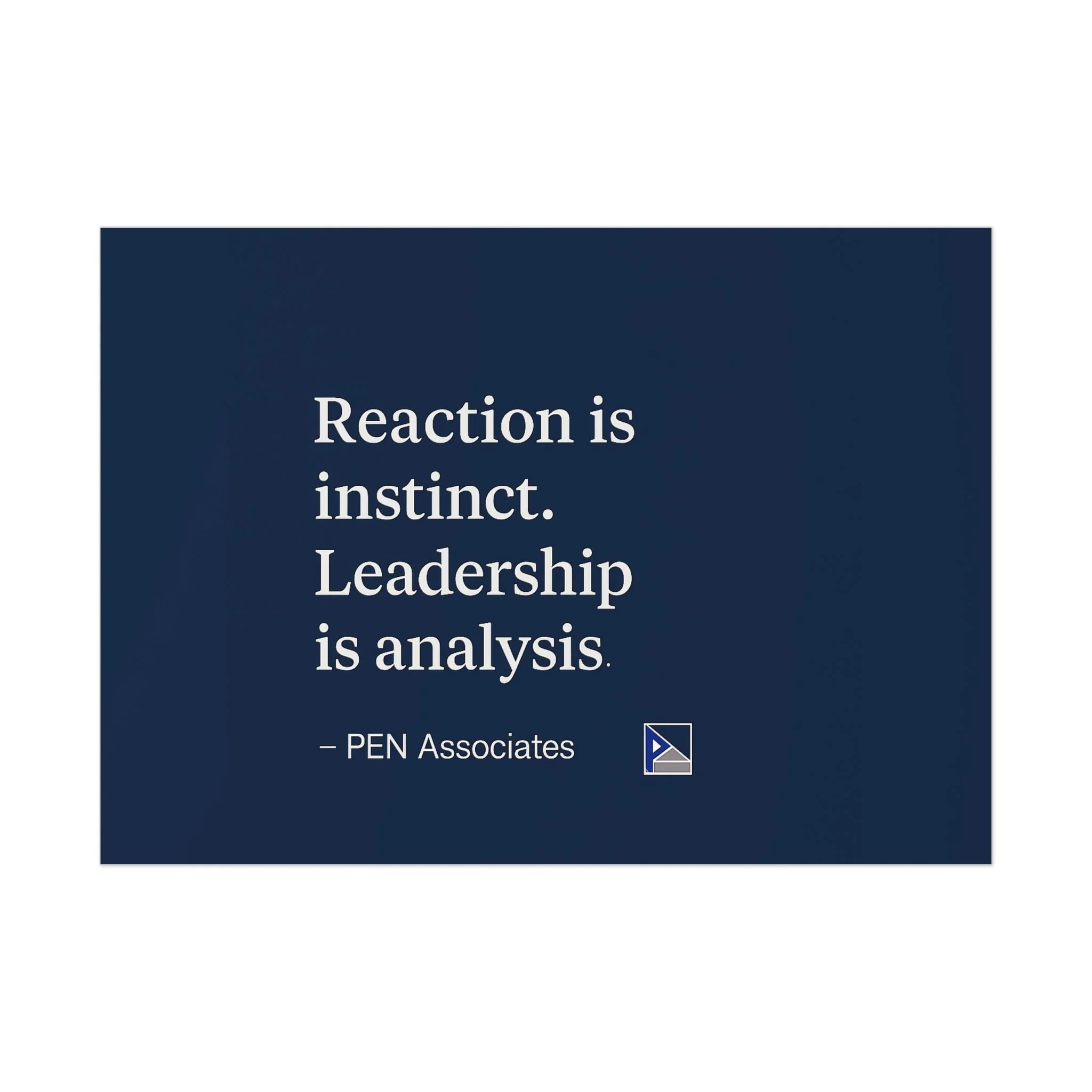 A minimalist uncoated poster with quiet confidence. Deep navy background and clean serif type create a contemplative mood: “Reaction is instinct. Leadership is analysis.” Printed on smooth, uncoated white paper, the design reads like a calm reminder in a home office, study, or boardroom corner. It won’t glare under lamp light; instead it invites a second look and thoughtful pause. Choose horizontal, vertical, or square to fit your wall and let this understated print become a subtle anchor in a neutral, modern space.