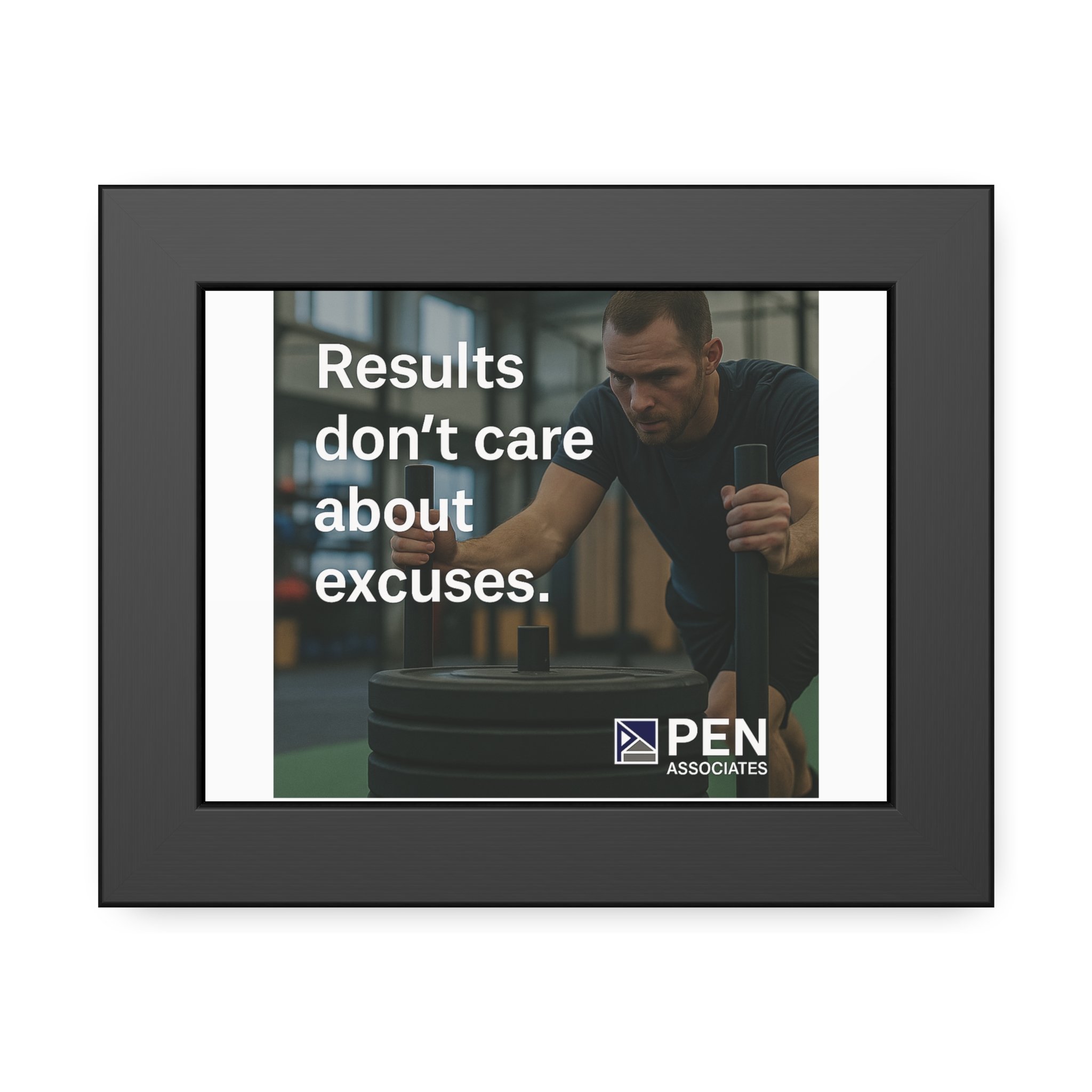 A bold, framed paper poster that brings focused energy to any training space or office. Printed on your choice of fine art or semi-gloss paper, the image sits inside a matte black pinewood frame with shatter-proof plexiglass and brown paper backing. Pre-installed hanging hardware and rubber bumpers make it simple to mount straight and protected on the wall. The composition pairs a gritty gym scene with the direct message “Results don’t care about excuses,” making this piece a quiet, persistent challenge to keep moving forward during early mornings, long sets, or planning sessions.
